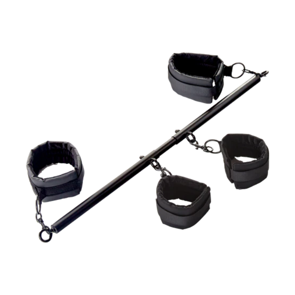 Submit to lust and bare it all with this bar set. The four included cuffs and expandable bar allow for simple control or a variety of compromising positions. Feel the soft cuffs against your skin as your partner tightens them around your wrist, ankles, or both. Give in to their control as the bar extends, holding you in place. Passion, power, and pleasure collide in an unparalleled experience.